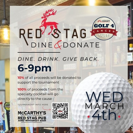 Event Information Golf 4 Cancer LV Dine to Donate Join the Golf 4 Cancer Lehigh Valley team for a dine to donate benefitting CSCGLV.McCarthy's Red Stag Pub6-9pmFood and drink specials with a portion of the proceeds benefitting CSCGLV.